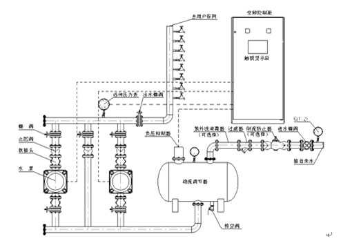 RWG系統(tǒng)智能型無負壓變頻供水設(shè)備是由穩(wěn)流調(diào)節(jié)器、負壓抑制器、水泵機組、智能變頻控制柜、遠傳壓力表、各種閥門管件等組成。其原理圖如下所示。